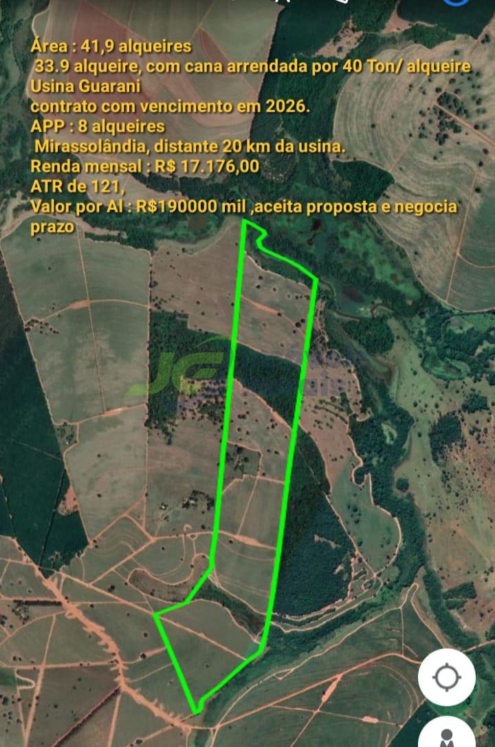 SITIO COM 41,9 ALQ. NA REGIÃO DE MIRASSOLÂNDIA – SP, 33,9 ALQ. EM CANA , USINA GUARANI ( TEREOS ) A 40 A TON ANO , CONTRATO ATÉ 2026 , ATR DE 121 , APP DE 08 ALQ.